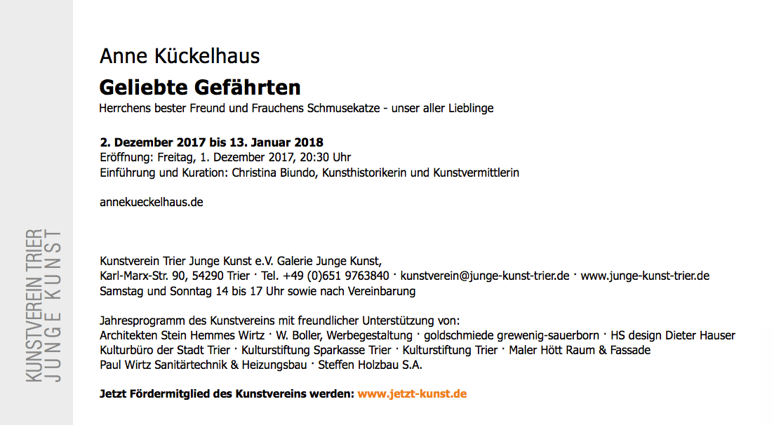 12/05/2021 · veranstalter war der gemeinnützige verein kultur raum trier e.v., der auch ausrichter des poetry slam trier ist... Gefördert werden künstler, kulturschaffende und gemeinnützige einrichtungen, die das kulturangebot in … Ihnen werden auf der karte die entsprechenden städte mit ihren stiftungen angezeigt. Die einwilligung gilt als unbefristet erteilt. Die förderung der kunst umfasst die bereiche der musik, der literatur, der darstellenden und bildenden kunst und schließt auch folgende.. Eeva karhu, path (moments), summer 5, 2019 (the artist, courtesy person projects | helsinki school) per kirkeby, untitled, 2016 (the artist, courtesy borch editions, copenhagen/berlin)